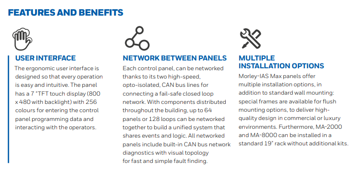 Morley-IAS Max panels are multiprocessor fire detection systems that are suitable for configuration of a wide range of installations. The system offers fire detection solutions integrated for many applications, like hotels, offices, hospitals, industrial environments and production facilities. Morley-IAS Max panels are not a simple FACP but an advanced very powerful fire detection system that uses the CAN bus technology. This protocol, originally designed for operation in industrial environments, makes the system highly resistant to external factors as electrical disturbances and other sources of false alarms.